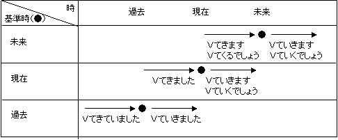 7 以特定的時間點為基準,要表示從基準點以前的時間往基準點推進‧變化的情況用「Vてきます」(例句(5)),要表示從基準點往以後的時間點推進‧變化的情況用「Vていきます」(例句(2))。