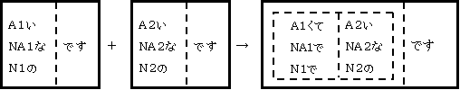 例:きれいなアパート+静かなアパート→きれいで静かなアパート